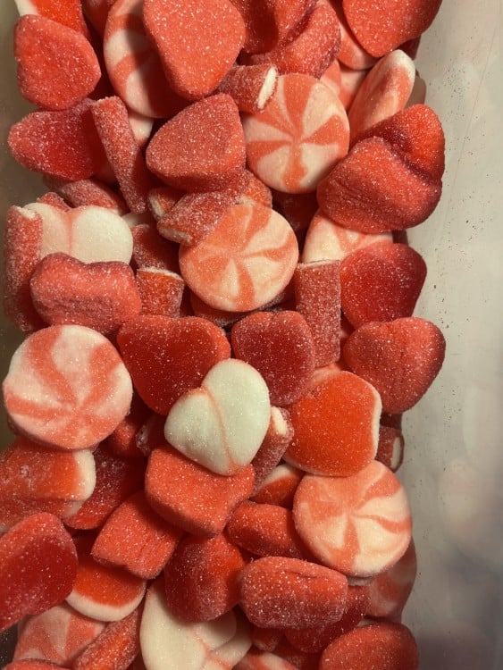 - قطع جيلي على شكل قلوب حمراء وبيضاء، تضفي لمسة من الرومانسية والبهجة.